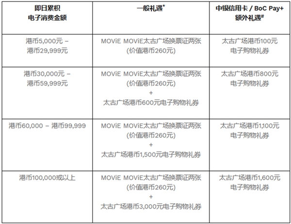 *一般顾客及合资格中银信用卡客户(统称「顾客」)须登记加入太古广场above会员计划及以电子货币即日消费累积满指定金额,方可换领一般礼遇及中银信用卡/BoC Pay+ 额外礼遇。每位顾客每日最多只限换领礼遇一次。 礼遇数量有限,先到先得,换完即止。