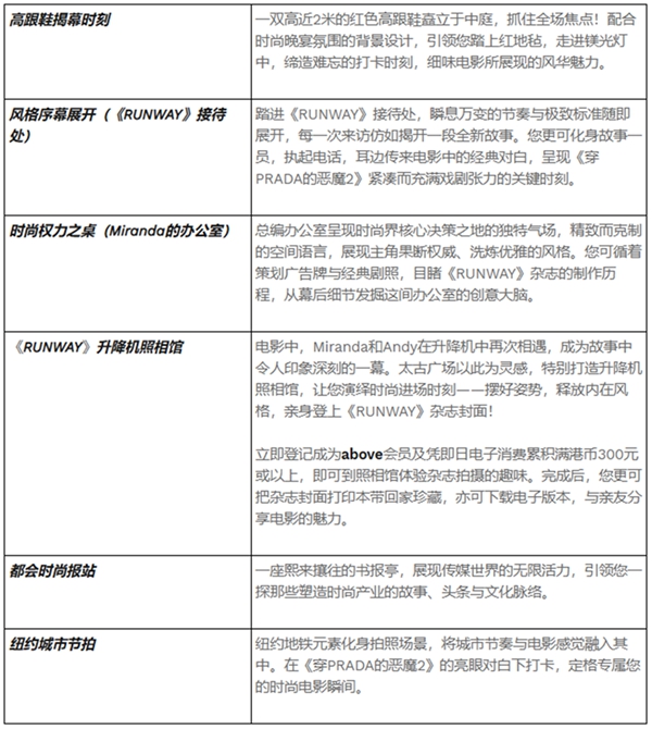 中庭矗立一双高近2米的瞩目巨型红色高跟鞋,以鲜明大胆的造型吸引目光,捕捉电影的戏剧张力与时尚魅力,创造出完美的「封面镜头」。环绕四周,一系列标志性的《RUNWAY》场景跳出银幕,细节设计展现时尚世界的精致美学,让您走进镁光灯聚焦时刻。