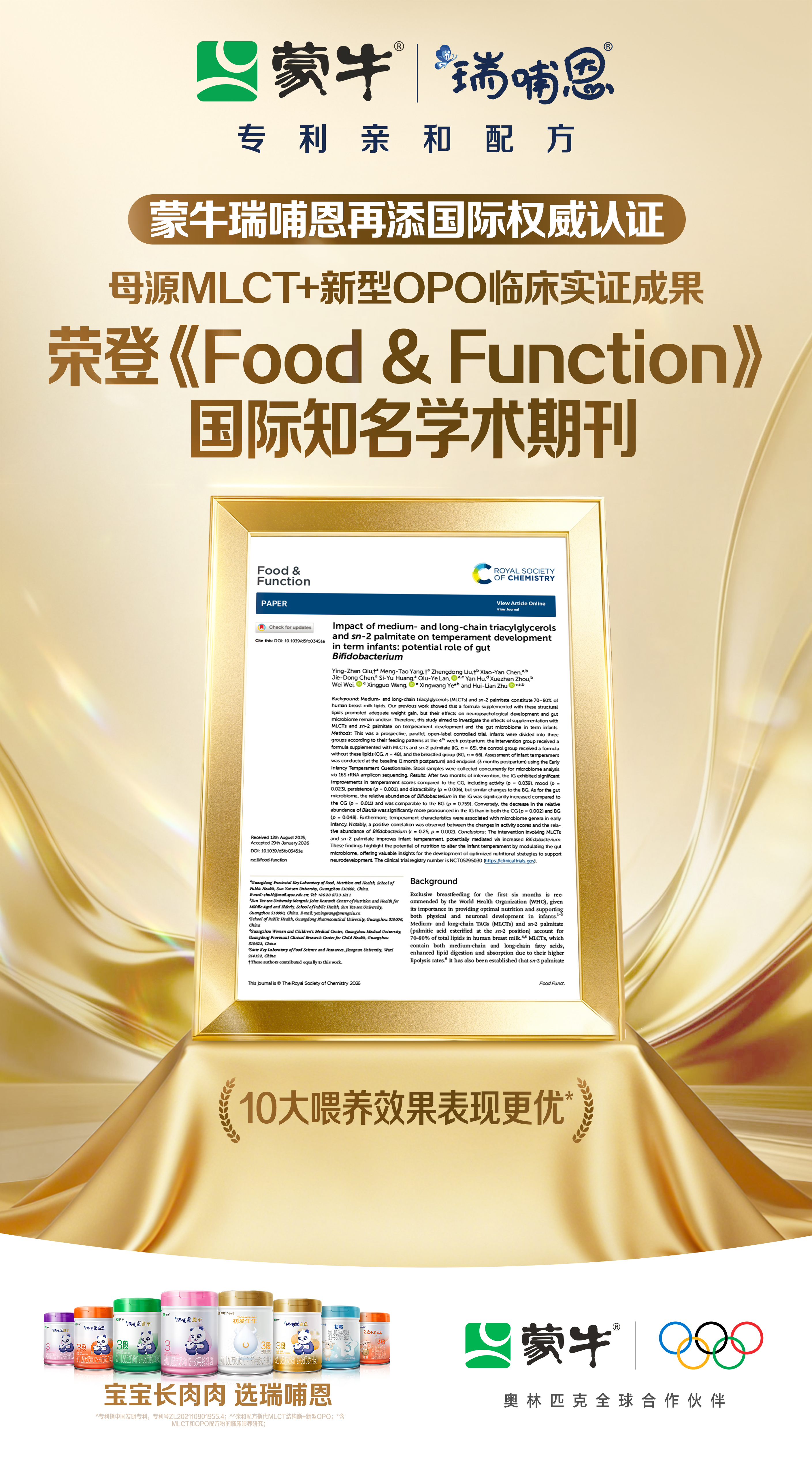 基于前沿科研,蒙牛正式预告旗下高端婴配粉品牌瑞哺恩迎来重大升级,蒙牛全球首款有机MLCT和新型OPO婴配粉“瑞哺恩菁至”与首款应用了自研MLCT+HMO专利[5]的婴配粉“瑞哺恩亲悠”即将重磅上市。这不仅展现了蒙牛将实验室成果快速转化为高端产品的“蒙牛速度”,更标志着国产婴配粉正以自主科技,重新定义高端品质。
